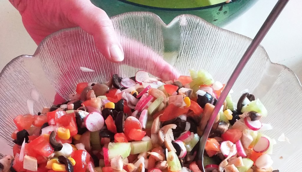 Entre tomates, concombres, champignons, radis, olives noires, maïs… il y avait de quoi s’amuser à reconnaître et nommer tous ces trésors colorés.