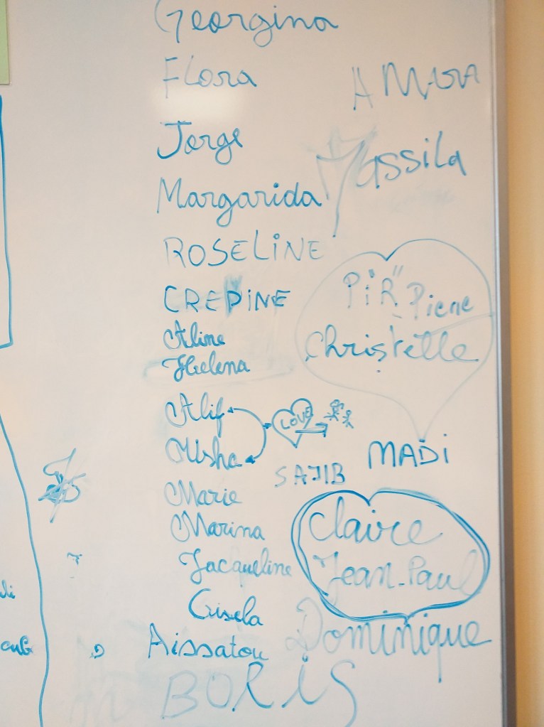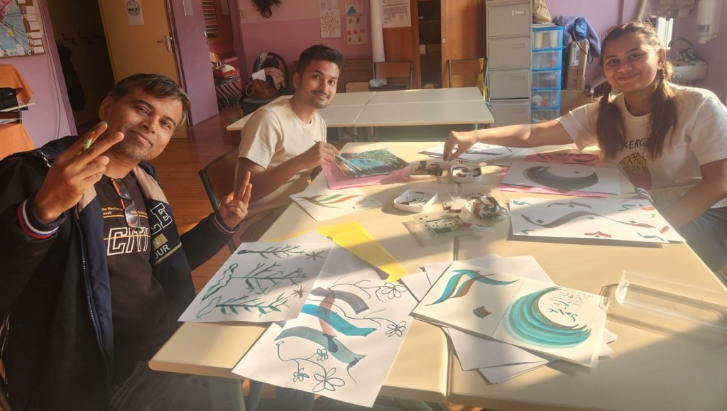 Pour briser la glace, chacun a écrit son prénom en français et dans sa langue maternelle sur le tableau. Fariba, toujours inspirée, a choisi d’y inscrire le mot « Bienvenue », ouvrant ainsi la porte à la convivialité et à l’échange. Nos yeux se sont émerveillés devant les graphies complexes et délicates du bengali, la langue du Bangladesh. Les arabesques fluides de l’alphabet persan, illustrant le dari, déployaient leur élégance sous la main experte de Fariba. Chaque trait, chaque courbe devenait une invitation à découvrir des cultures et des histoires personnelles.