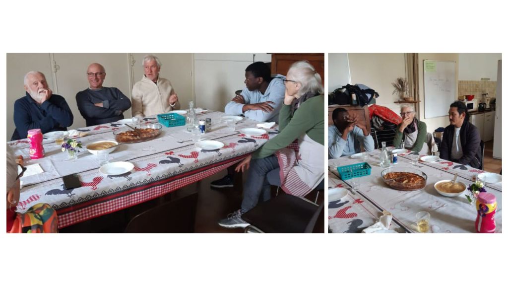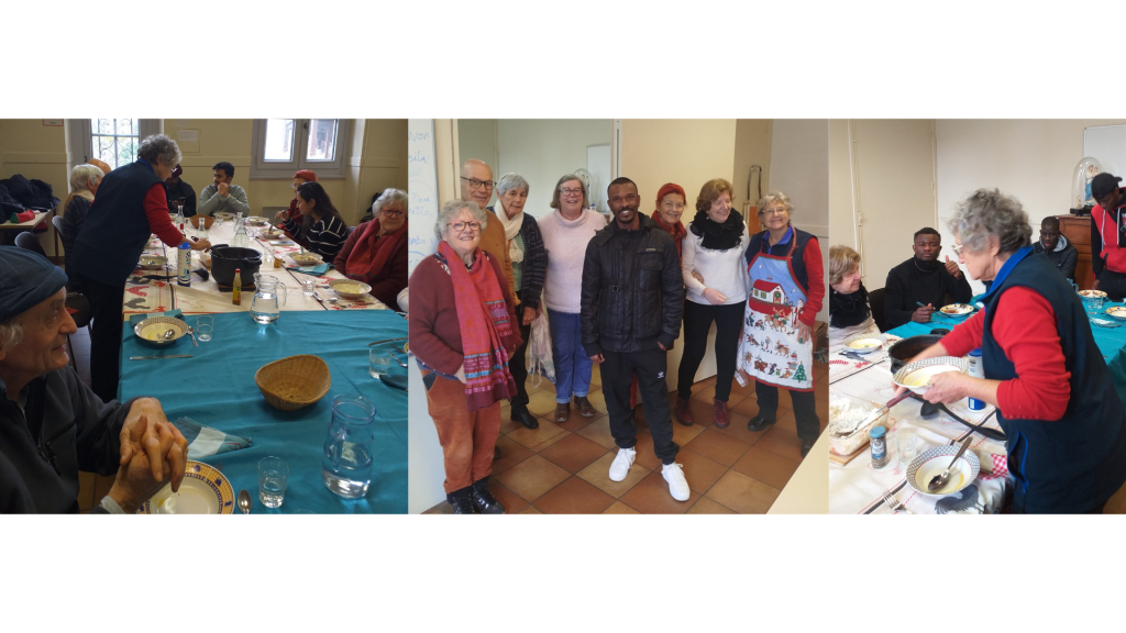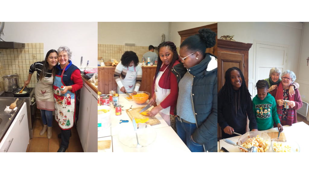 Alphonse, Mallyum, Sangpo, très efficaces, ont cuisiné aux côtés de Chantal, Janine, Maguy et Gisela. L’effervescence régnait en cuisine : on pèle, on coupe, on surveille les cuissons, chacun apportant sa touche personnelle au menu du jour.
