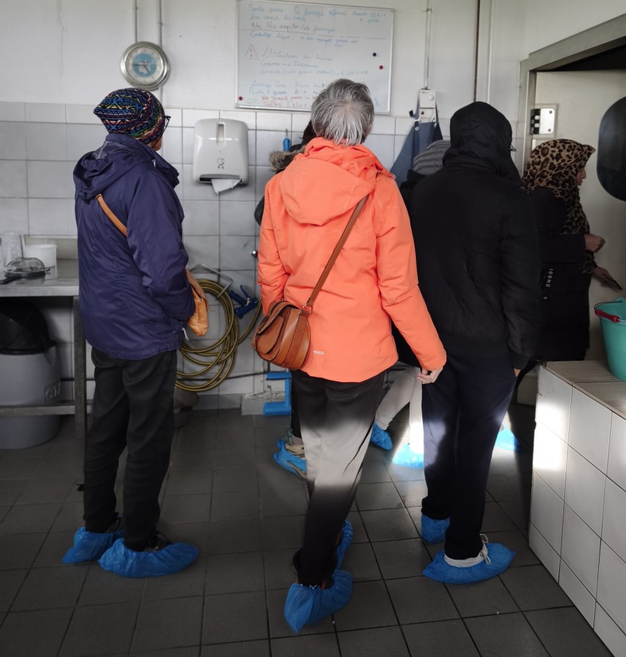 Ils ont ensuite accédé à la laiterie, à la salle de fabrication fromagère et au saloir, en prenant soin de respecter les normes sanitaires en enfilant des sur-chaussures.