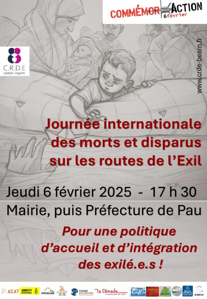 Ce 6 février 2025, à Pau, nous étions rassemblés devant la Mairie, puis la Préfecture, à l’appel du CRDE Solidarité Migrants Pau-Béarn et de plusieurs associations engagées pour les droits des exilé(e)s. Cette date marquait la 10ᵉ Journée Internationale des Morts et Disparus aux Frontières et sur les Routes de l’Exil.