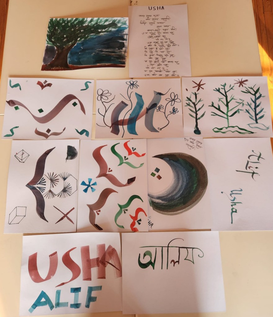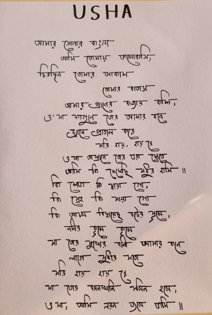 Moment fort de l’après-midi : Usha, avec une dextérité fascinante, a calligraphié l’hymne national du Bangladesh. Chaque mot prenait vie, empreint de fierté et de douceur. C’était bien plus qu’un exercice de calligraphie, c’était un moment de partage culturel puissant et émouvant.