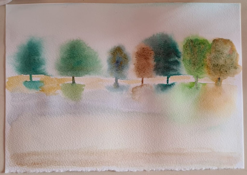 Des créations individuelles ont rapidement vu le jour. Les petits tableaux, d’abord timides, ont gagné en audace et en complexité. L’évolution de l’outil, du pinceau à la spatule, a ouvert la porte à d’autres types de créations : des paysages poétiques, des arbres délicats à l’encre et à l’aquarelle.