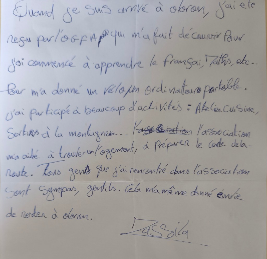 Depuis octobre 2016, Oloron Sainte-Marie accueille ce qu’il est convenu d’appeler « des migrants ». Cet accueil est le résultat d’une double démarche, de la municipalité d’Oloron en réponse à la demande des pouvoirs publics et d’un collectif citoyen du pays d’Oloron, créé à l’initiative de Pierre-Louis Giannerini. C’est le démantèlement de la jungle de Calais qui a mis en action ce collectif dans le cadre tout d’abord d’un C.A.O. (Centre d’Accueil et d’Orientation) transformé au bout de six mois en un C.A.D.A. (Centre d’Accueil pour Demandeurs d’Asile), structure permanente de 40 places gérée par l’O.G.F.A. (Organisme de Gestion des Foyers Amitié).