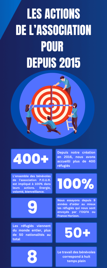 L’objectif de P.O.U.R est l’accompagnement des demandeurs d’asile vers le statut de réfugié et leur insertion professionnelle. Cette mission se réalise à travers différentes activités et actions à commencer par l’enseignement du Français jusqu’au parrainage pour l’intégration dans la cité et l’insertion professionnelle.